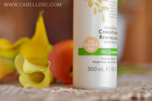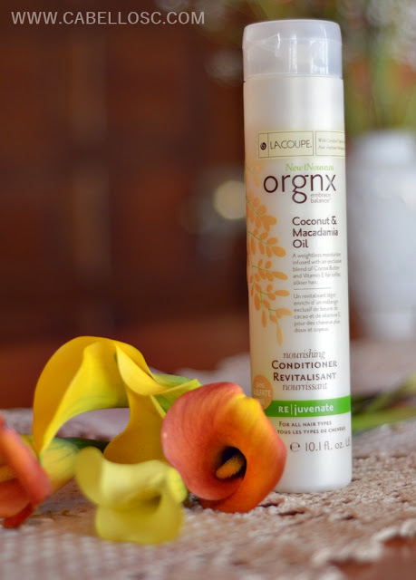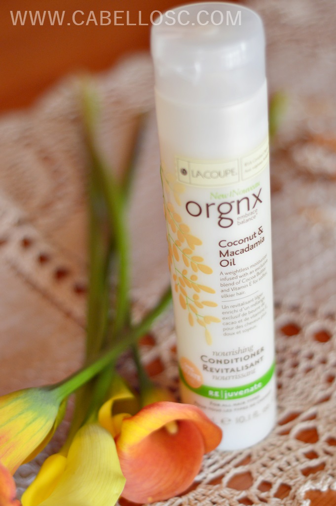 Como les dije, esta marca no la conocía ni había escuchado de ella en ningún lado. Este acondicionador es de la línea Orgnx que se vende como "natural" y dice tener ingredientes botánicos, libre de preservantes, sulfatos y cuida el color del cabello. Está indicado para todo tipos de pelos.