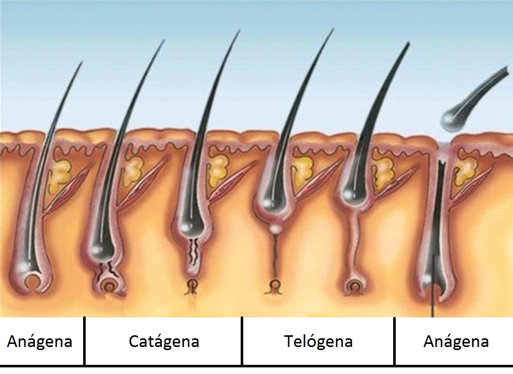 Fase telógena: Esta fase es la que se denomina de reposo y puede durar unos 4 meses. Aquí la hebra de pelo se desprende totalmente del cuero cabelludo y se cae, aunque a veces queda enganchada en el cuero cabelludo pero sin recibir nutrientes por lo que no va a seguir creciendo.